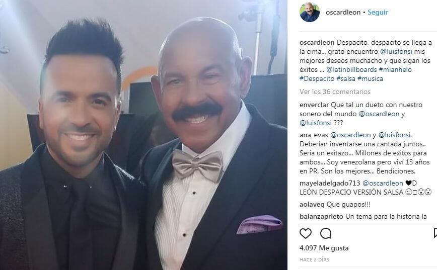 «Despacito, despacito se llega a la cima… grato encuentro Luis Fonsi. Mis mejores deseos muchacho y que sigan los éxitos», escribió Óscar D’ León.